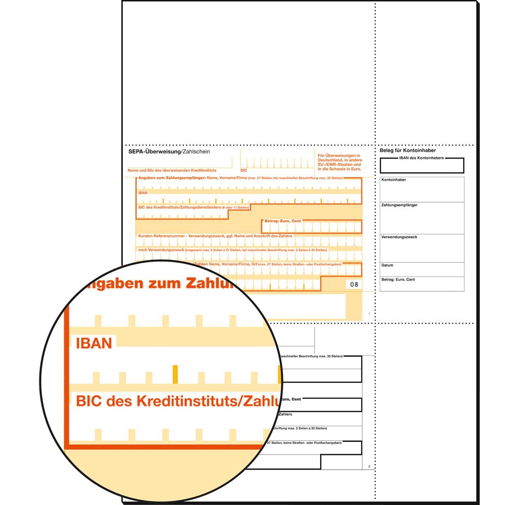 Sepa-Überweisung/Zahlschein: Format 4 1/6 zoll x 5 9/10 zoll rechts verleimt, selbstdurchschreibend blatt 1 90g/m² beleglesepapier blatt 2 55g/m² durchschrift für den kunden.